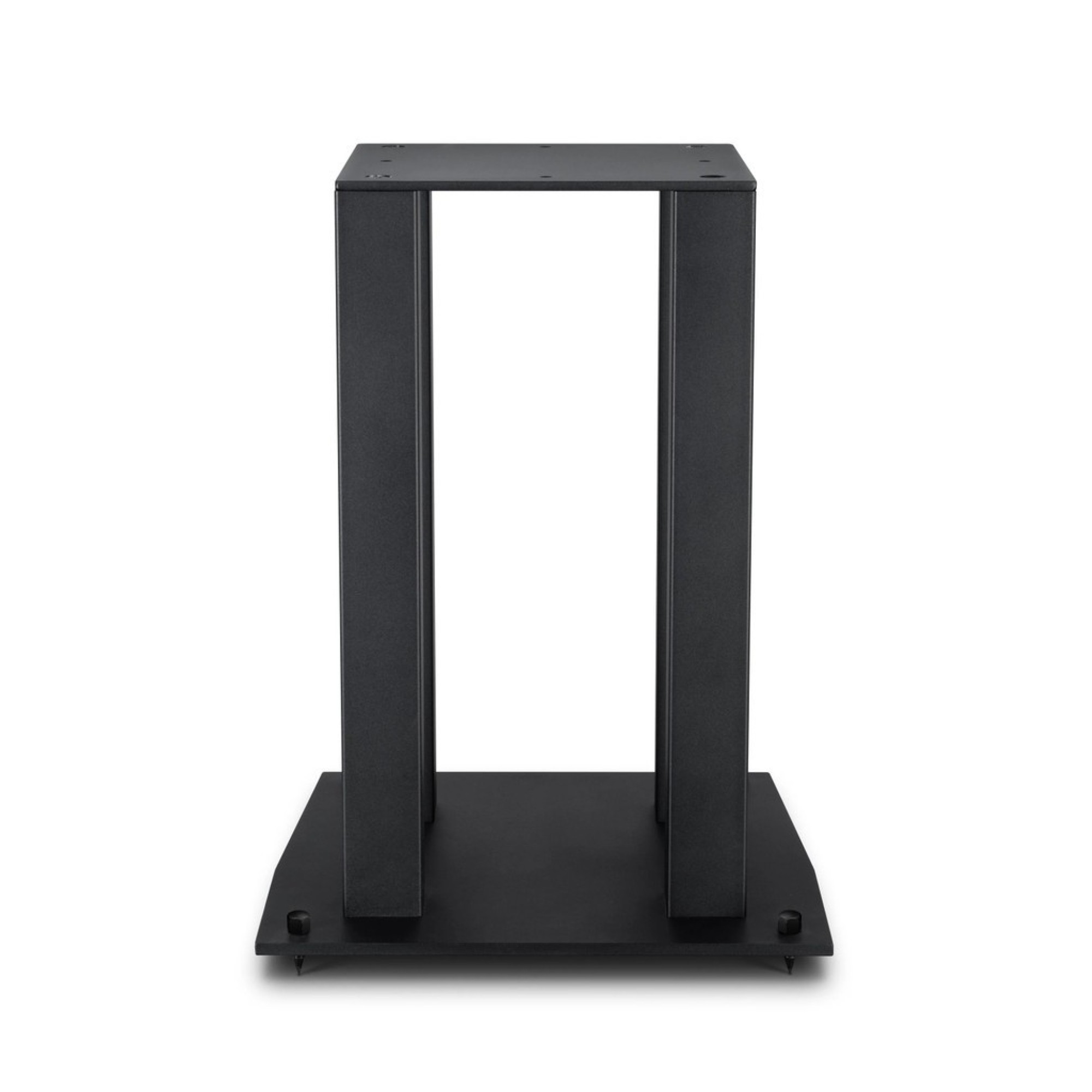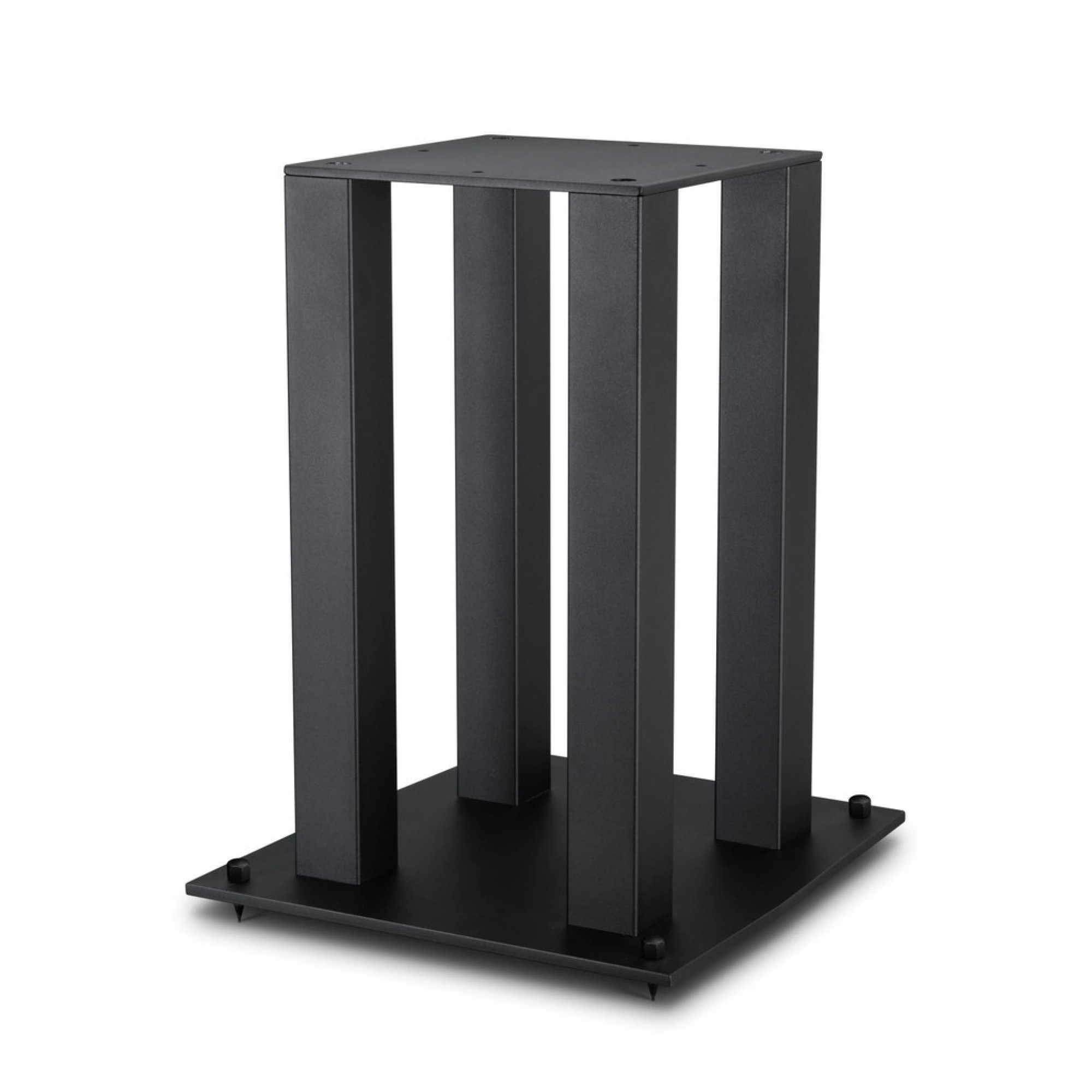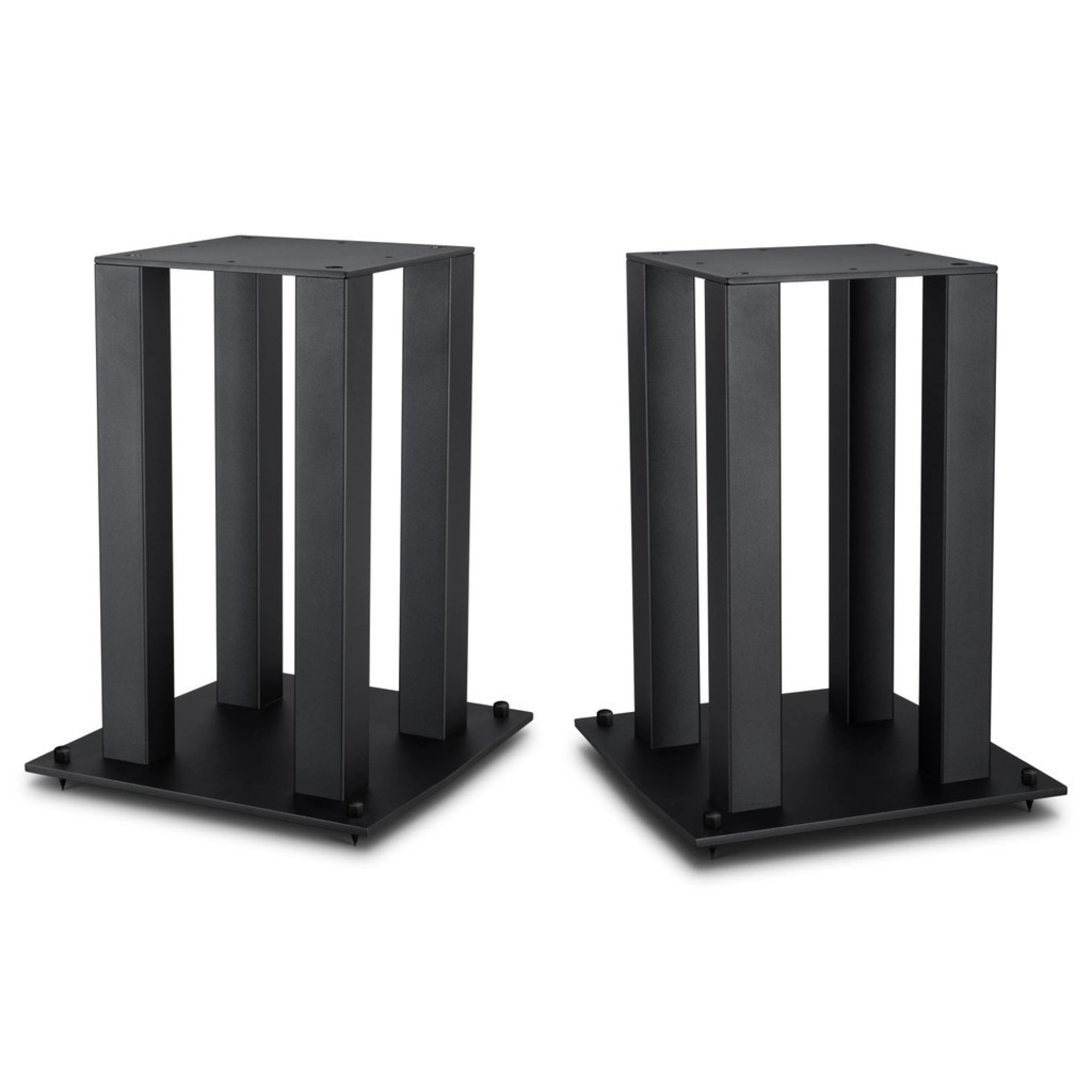 Custom-made for Mobile Fidelity SourcePoint 10 bookshelf loudspeakers, these 22-inch-tall stands raise your speakers to the ideal listening height and provide vibration-resistant support. Made of steel, the four-pillar design can also be filled for extra stability. The top plate measures 10 x 10 (WD) inches and is 0.125 inches thick; the base plate measures 14 x 15 (WD) inches and is 0.375 inches thick. Sold in pairs. Each set comes with spikes, spike plates, and neoprene and felt pads.