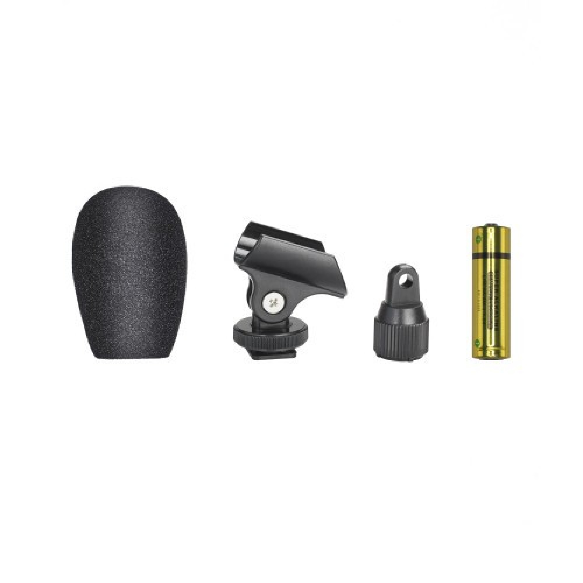 | ACCESSORIES FURNISHED | Professional camera shoe mount; interchangeable mic-stand base; foam windscreen; two 6.3 mm (1/4") mono adapters; AA battery |