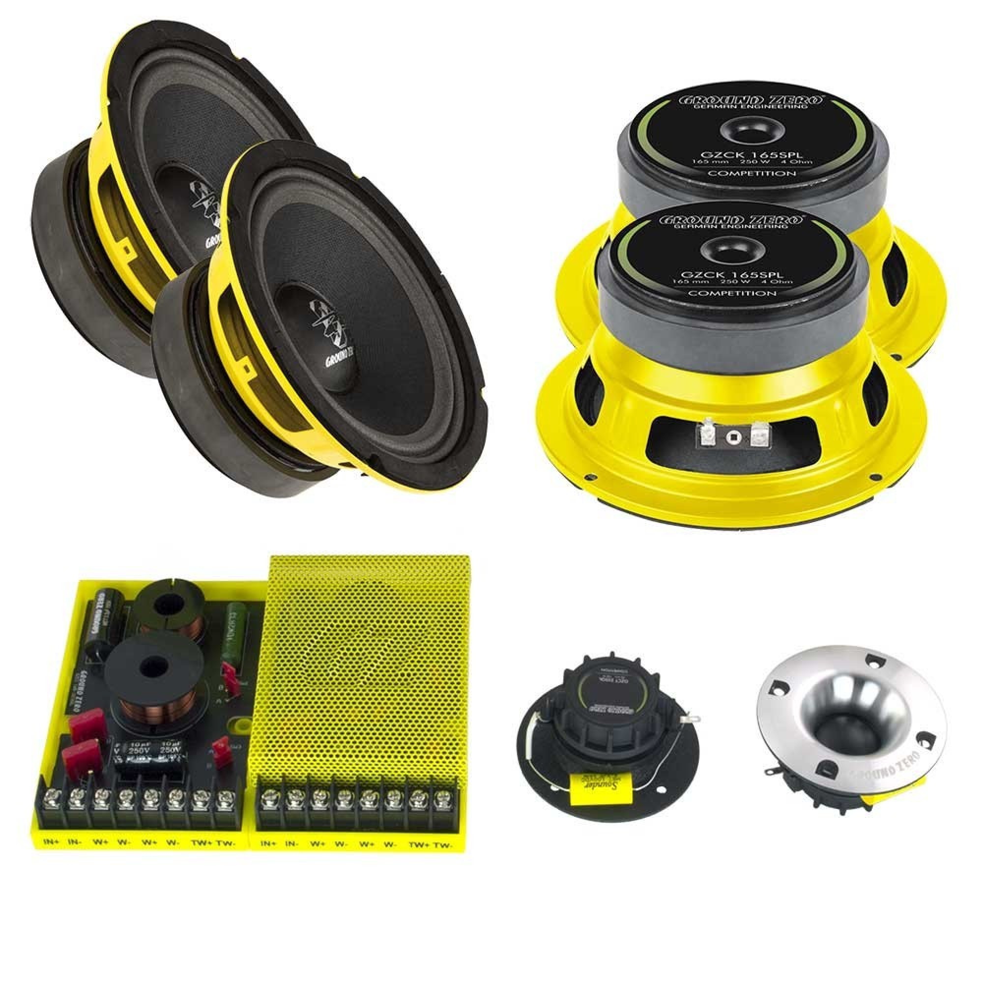GZCK 165XSPL woofer has high sensitivity, high power handling and great sound quality. One of a kind SPL-woofers that truly can play midbass tones with authority. GZCT 25SQL tweeter has also high sensitivity and power handling. And much better sound than bullet tweeters in same price category.