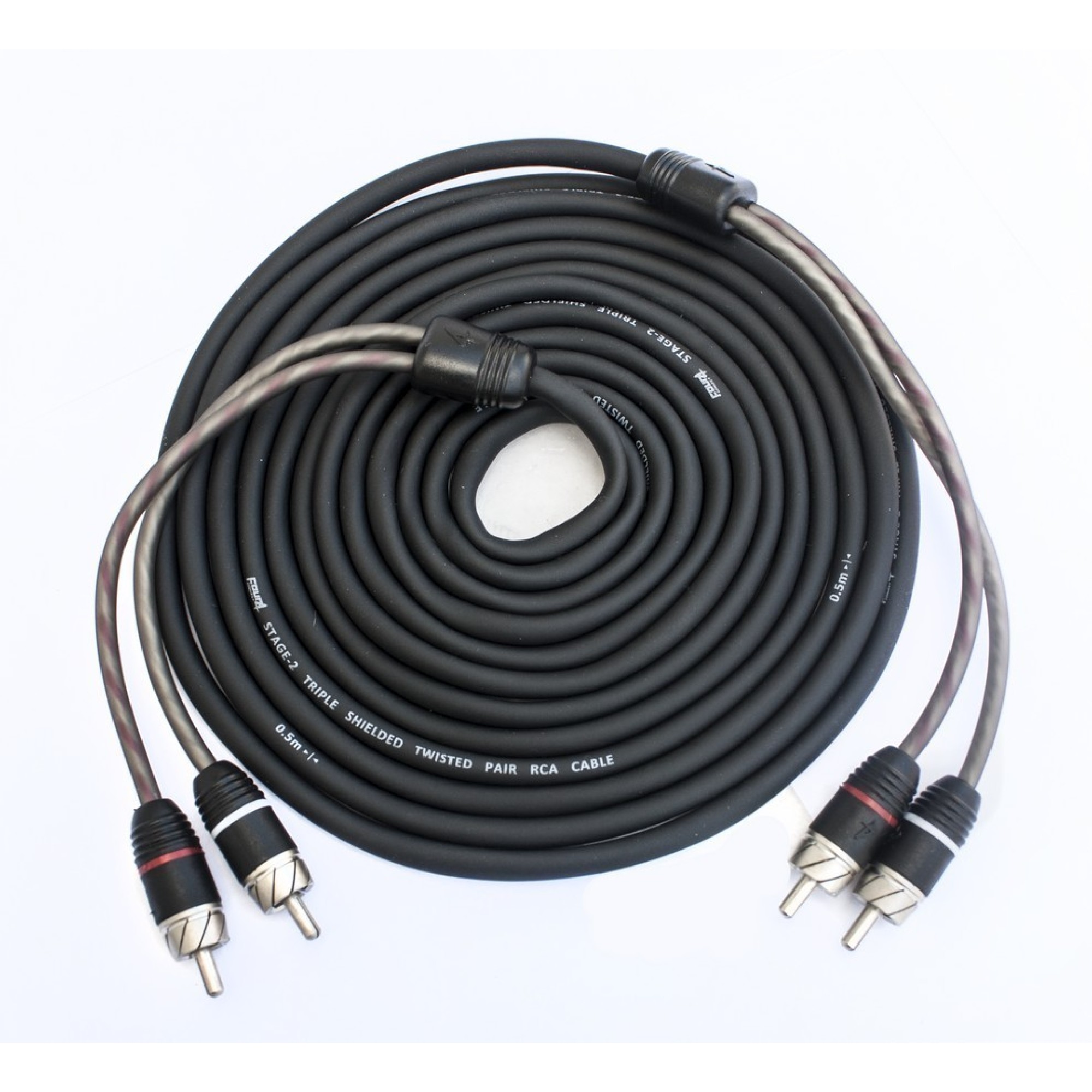 FOUR Connect STAGE2 RCA-cables are carefully designed to get best possible results. These cables have thicker than usual conductors that are made of tinned OFC ( T-OFC ). Triple shielded Twisted Pair structure eliminates unwanted noise. Another noise eliminating factor is an extra wire that is inside all cables. Conductors are also covered with foil to prevent inductive noises. Conductors are isolated with materials that are used in high voltage cables. This structure gives unbeliavable good noise supression that is especially important in car environment. Connectors are Rhodium-plated Bite Hold Molded Connectors ( BHMC ) and every connector is tested in factory that they have excellent grip. Connector housings are made of HDPE-plastic that has high insulation factor. Housings have opposite cone structure that works as a strain relief to cable. Outer extra wire can be used as a remote lead or noise supressing ground lead.