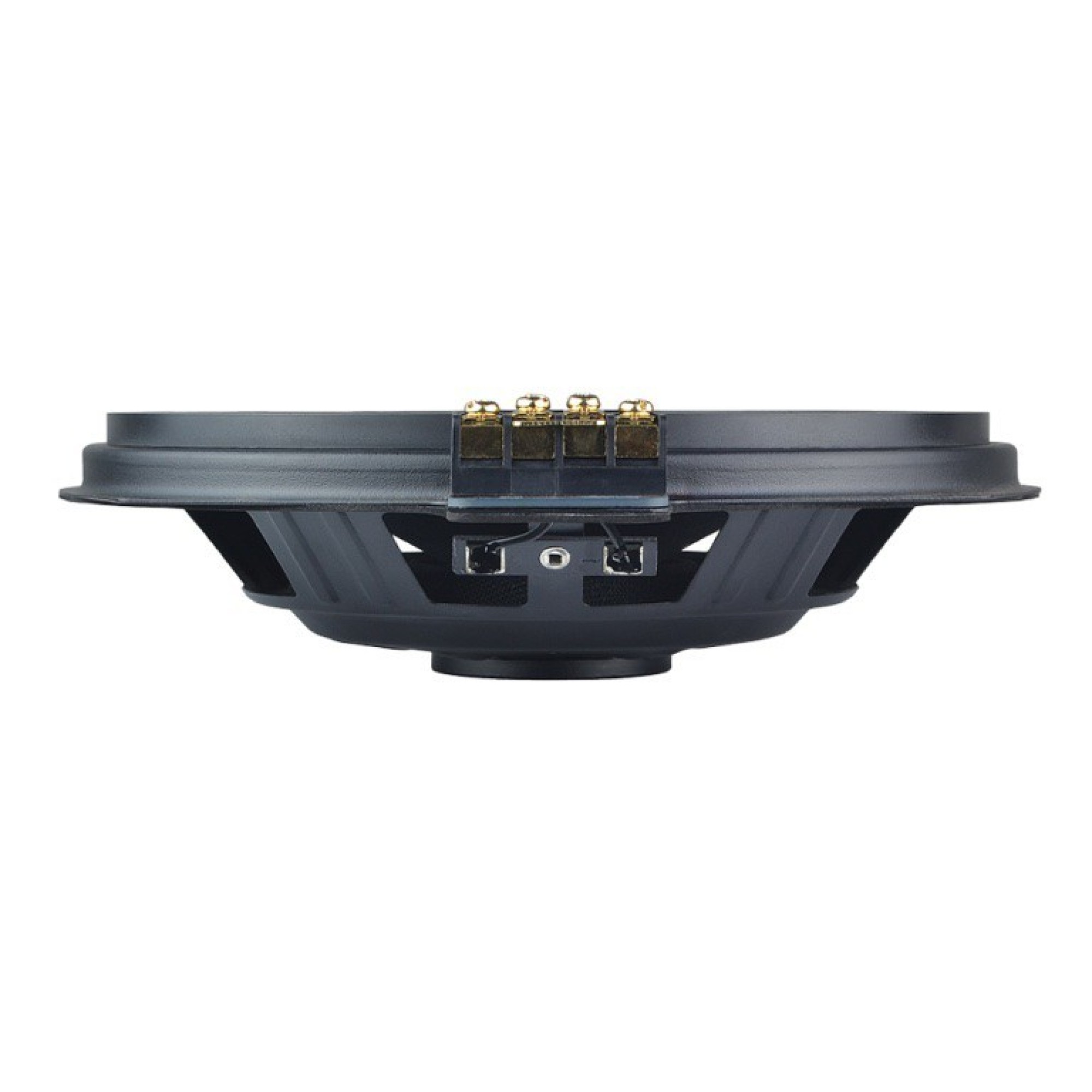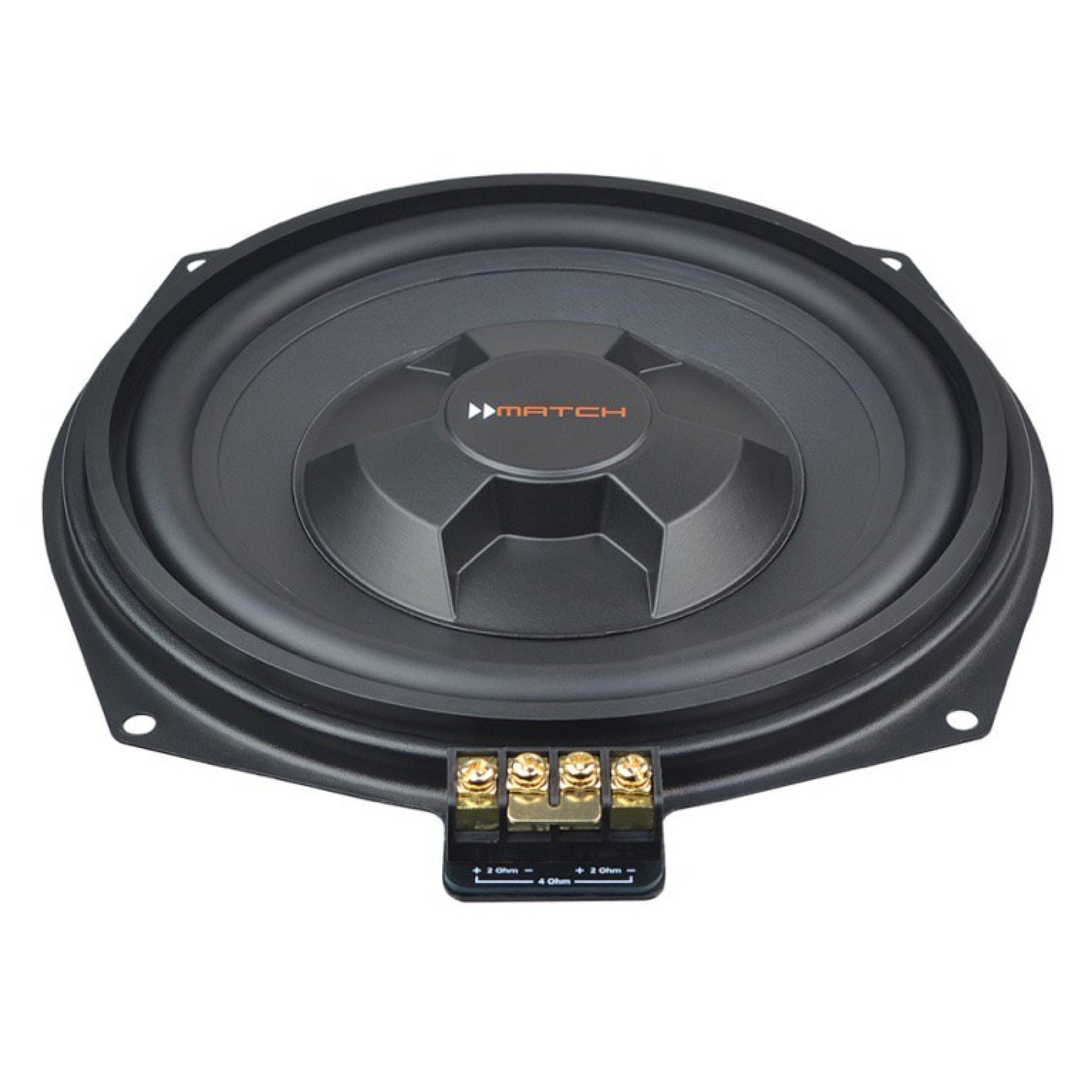 Nevertheless, these subwoofers are also perfectly qualified for universal applications. Thanks to the very low mounting depth, extremely compact sealed enclosures are no problem at all whereas the oversized 1.7” / 42.5 mm voice coil assures high power handling. Furthermore, the special speaker connector with its gold-plated screw terminals allows two different configurations and therefore flexible connection options. With the ex works installed connection bracket the subwoofer has an impedance of 1 x 4 Ohms, otherwise each voice coil can be driven individually (impedance 2 x 2 Ohms) and allows perfect combination with MATCH Plug & Play amplifiers.