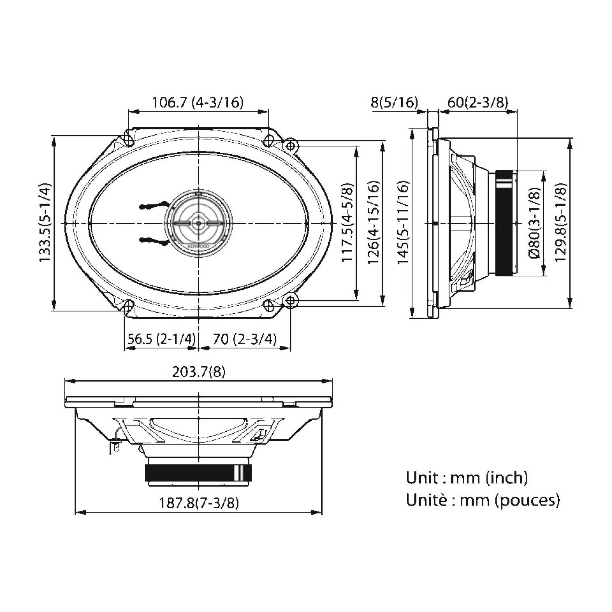 - (6” x 8”) žemų dažnių garsiakalbis