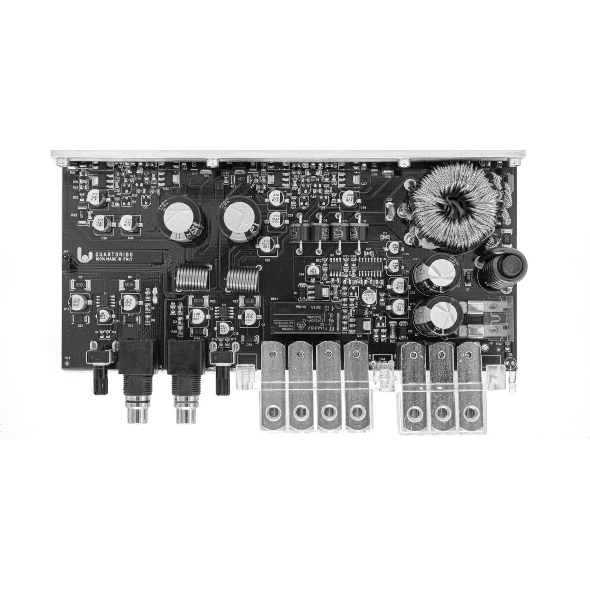 2-channel amplifier with class A/B circuit, integrated activ crossover and efficient, anodized heats..
