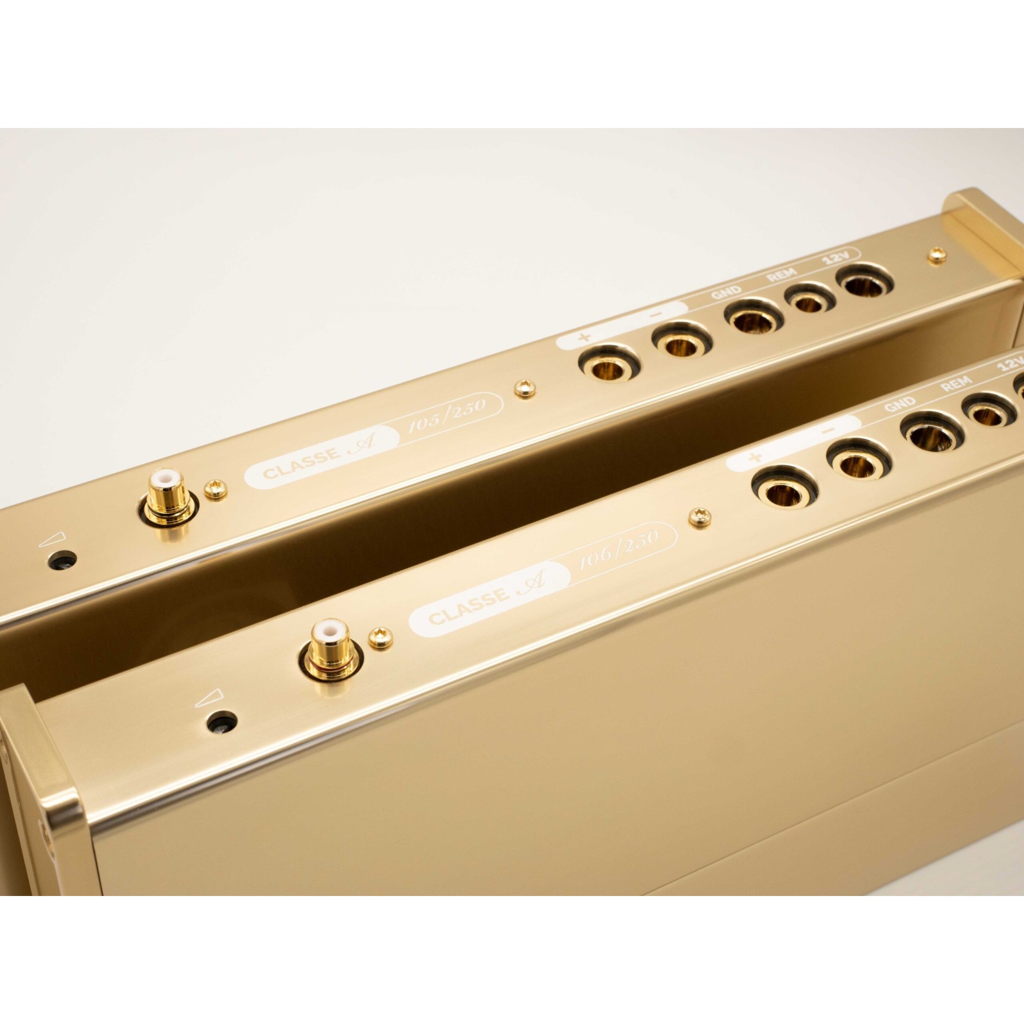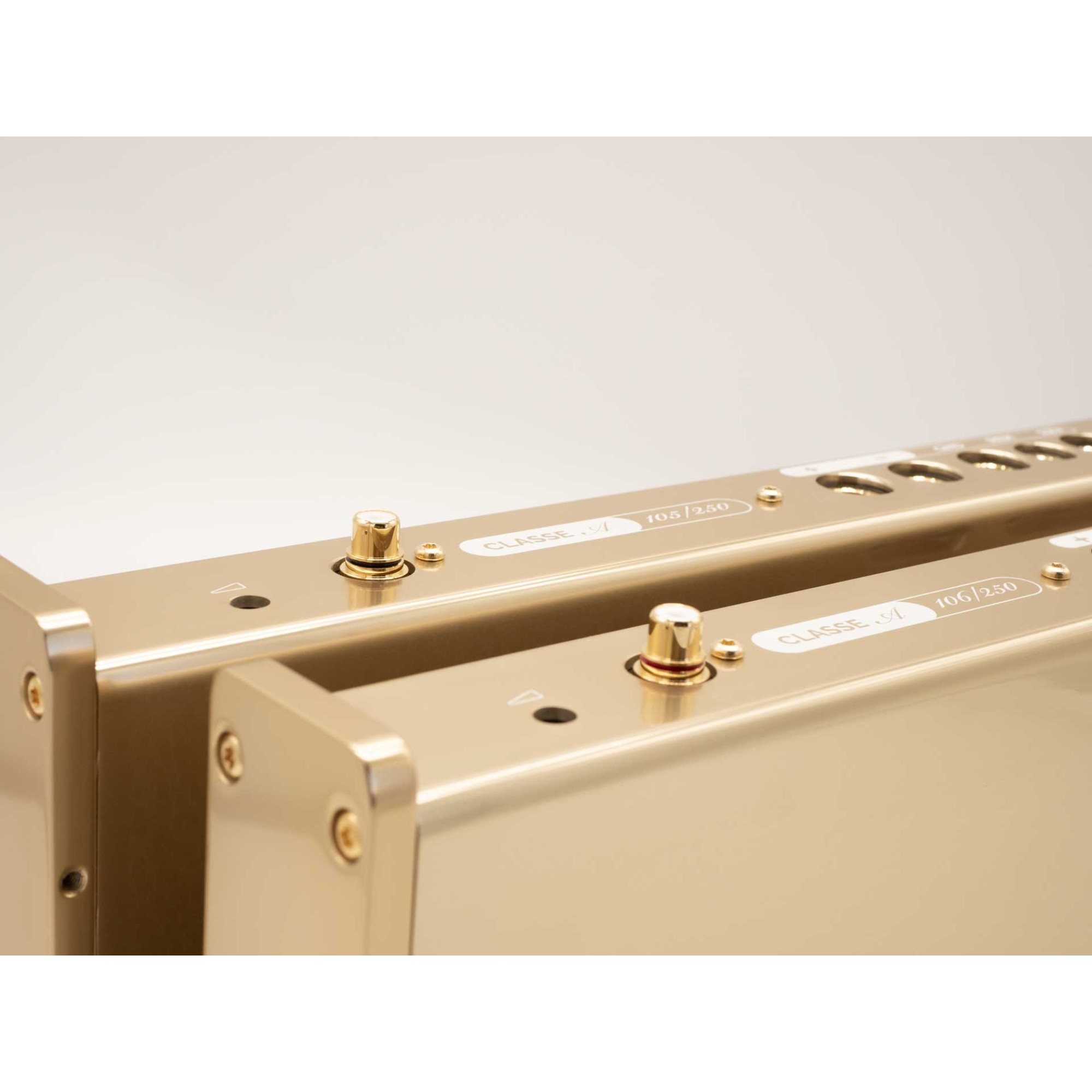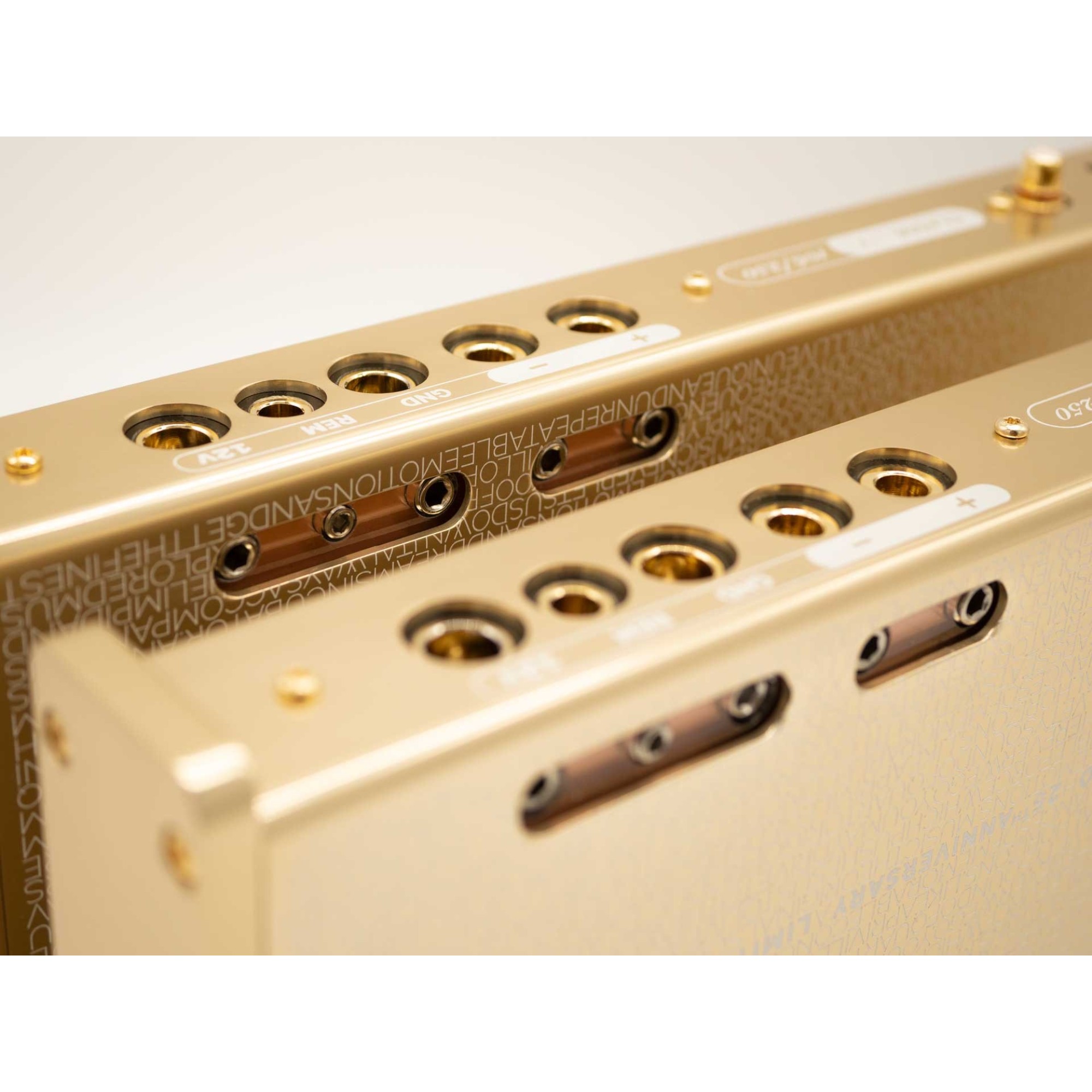 After the success of 20th Anniversary limited amplifiers Ingot 1 and Ingot 2 five years ago, for 25th Anniversary Limited Edition we developed a unique pair of mono amplifier in Class A, combining the best from all worlds, gold plated brass blocks connectors same as Desiderio, shiny and classy polished gold aluminium anodized and laser engraved chassis of Ingots 1 and 2 (20th anniversary limited edition amplifiers), Heritages’ and Precisions’ improved final stage and circuitry to make an even higher Class A polarization, for an outstanding clarity, accuracy and musicality.