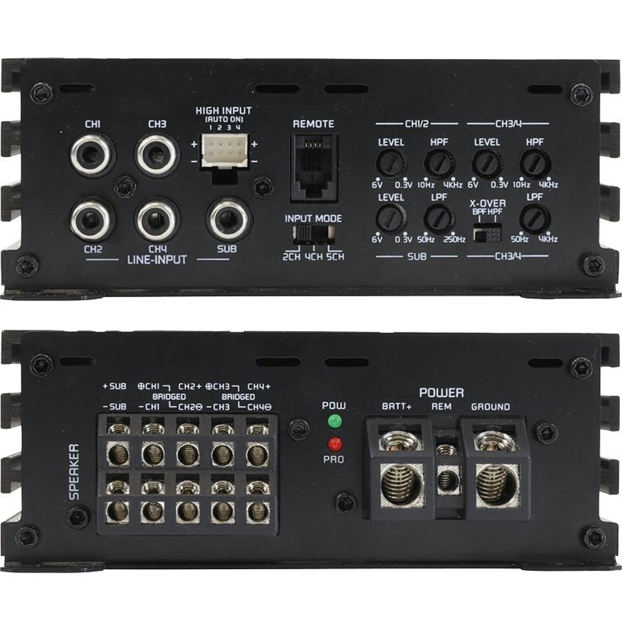 5-channel amplifier with high efficient class D circuit, integrated active crossover and compact dimensions
