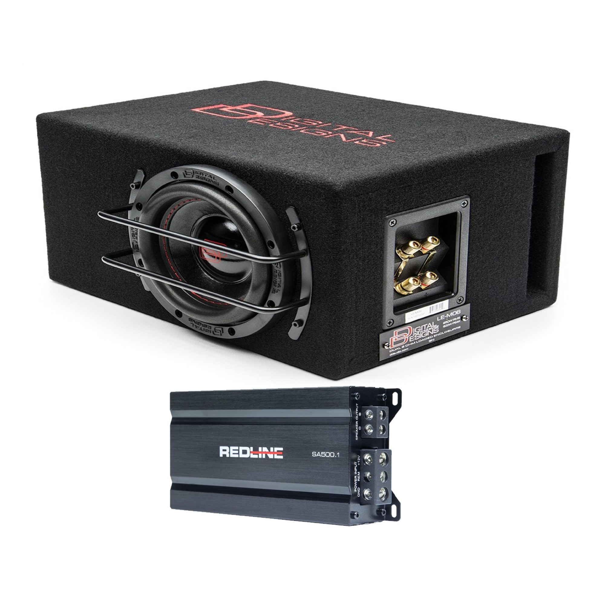 Very compact basskit! For its size, you have really wide installation possibilities, in any vehicle! The MINI6 kit includes DD Audio SA500.1 amplifier and LE-M06d subwoofer! SA Series amplifiers are compact amplifiers with full size features. The SA500.1 is a 1 ohm stable monoblock subwoofer amplifier with a continous output power of 500 watts. Even though the SA Series amplifiers are very compact they still employ set screw power and speaker terminals, different input sections, and heavy duty aluminum heatsinks. LE-M is more! DD Audio LE-M06d is a compact loaded enclosure. Next generation of famous LE-M06 is now even better. Driver has all new design that gives more lower bass thanks to lower fs-value. Spider, surround, cone and all parts of this little beast are re-thinked and re-designed to outperform the previous model