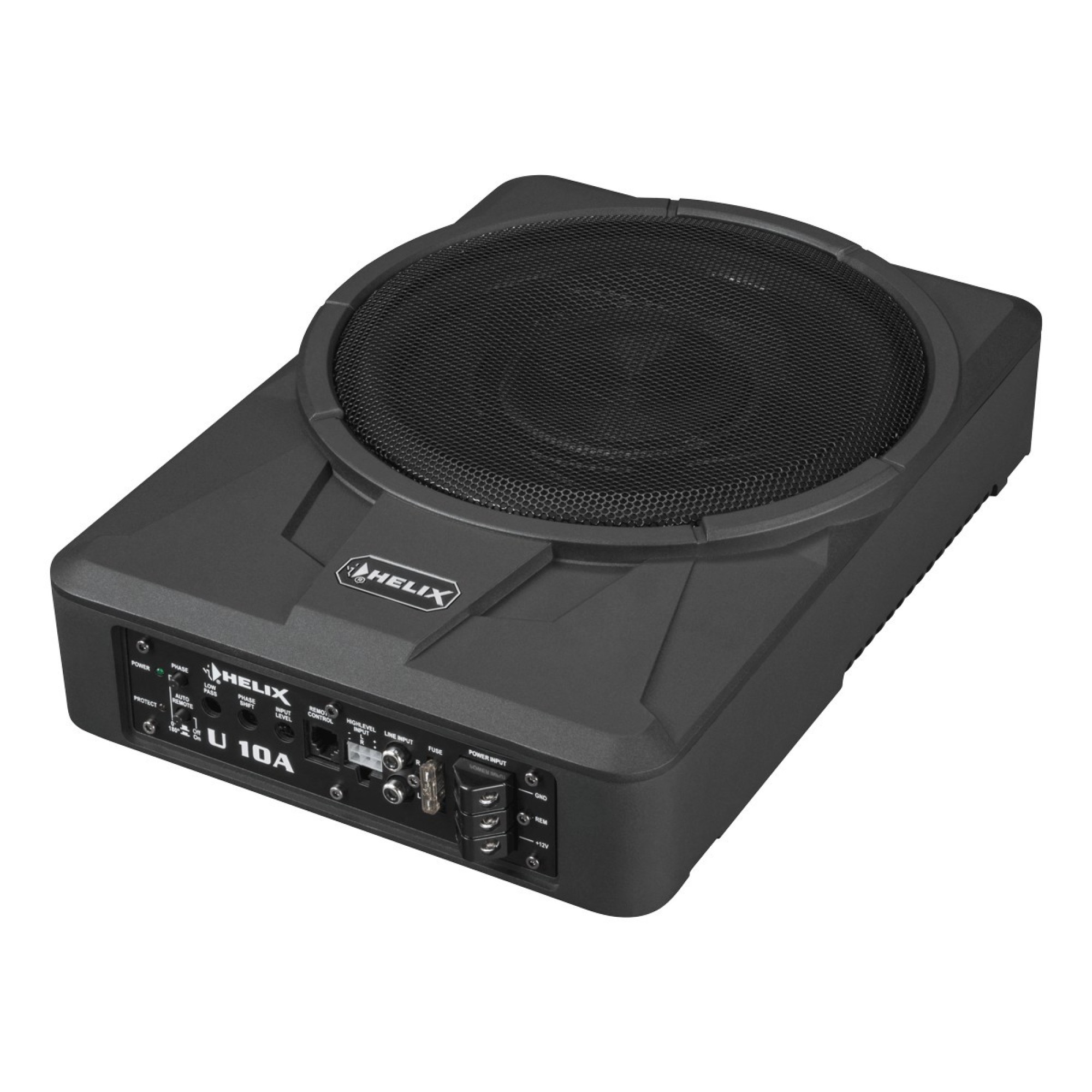Bass is in the smallest hut –If mounting space in the vehicle is scarce and existing car hifi systems badly need the ″extra kick″ in the low frequency range without great effort, the new HELIX active subwoofers U 10A and U 8A are the right choice. Driven by powerful, integrated Class AB amplifiers with 180 W RMS, the heavy-duty drivers with their rock-solid aluminum cones and heat-resistant voice coils easily transform the amplifier power into punchy bass. Thanks to comprehensive setting options like the adjustable, high-slope lowpass filter and particularly sensitive phase control, the low frequency reproduction can be perfectly adapted to the acoustic conditions inside the vehicle. Equipped with a 2-channel highlevel input with automatic turn on function as well as a 2-channel lowlevel RCA input a seamless integration is guaranteed. And thanks to the especially shallow cabinet design the installation will be a no-brainer, especially if space is extremely limited – these small ″bass boosters″ may even fit under the seats, for example.