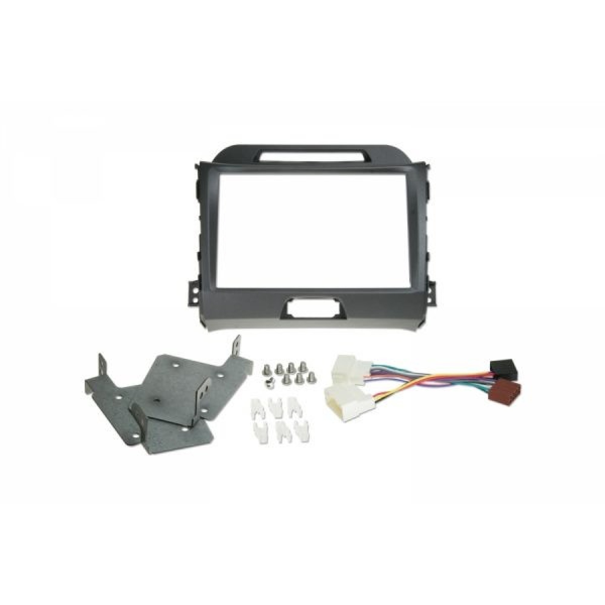 8″ grotuvo montavimo komplekte yra visos dalys, reikalingos INE-W928R montavimui ir prijungimui automobilyje Kia Sportage III: tvirtinimo dalys, rėmelis, prijungimo jungtys.