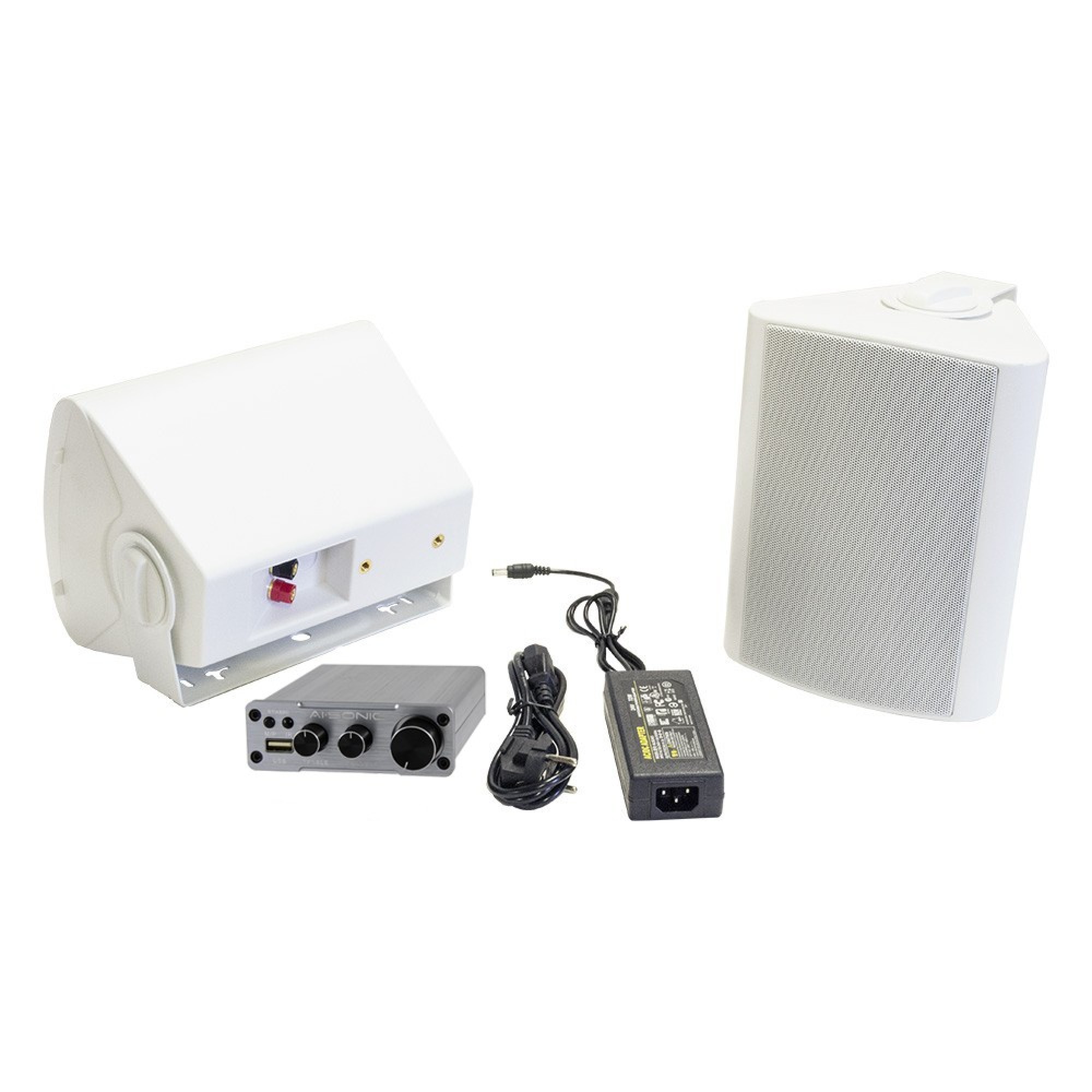 Package includes one amplifier and a pair of white speakers. Also available with black speakers.