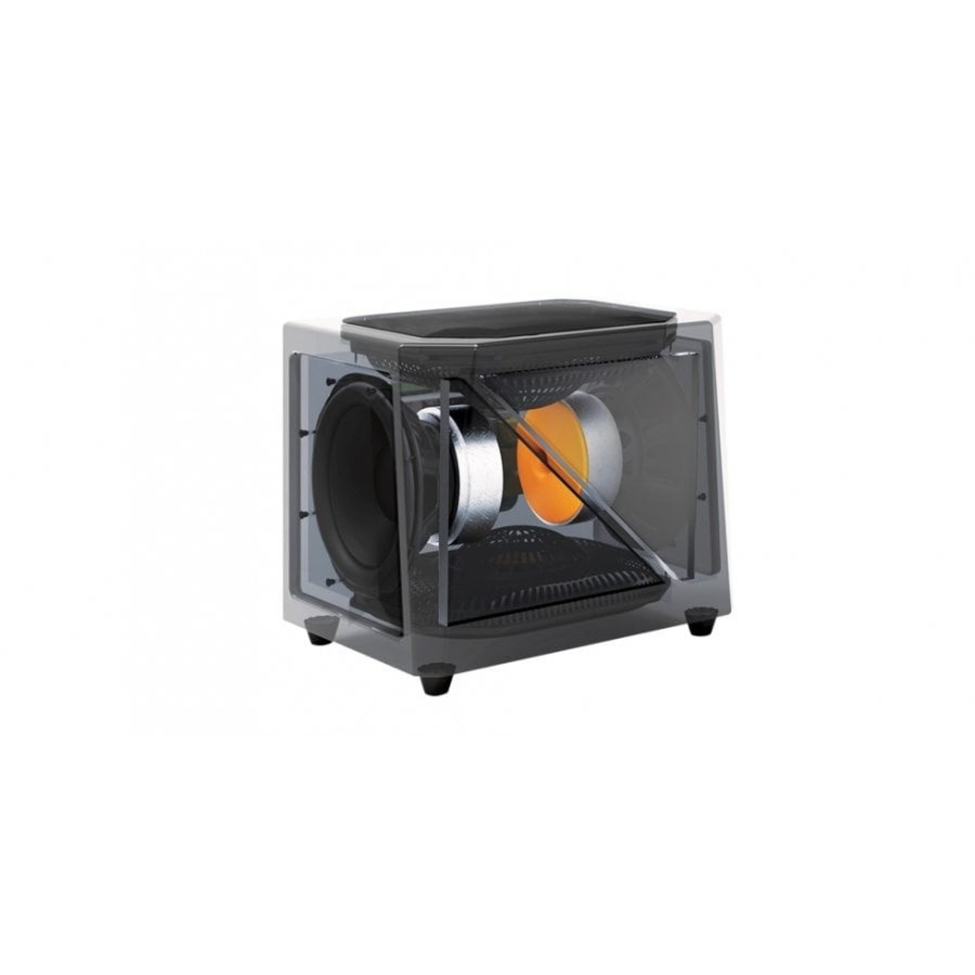 In order to achieve this, we have incorporated a unique, patented* 360 degree dual-plane inertially-balanced driver and sub-bass radiator topology, combined with a very advanced electronics package. With two active drivers separated horizontally in space, as well as two passive radiators separated vertically, the driver-to-room coupling is distributed much more smoothly, for in-room bass performance that can’t typically be achieved with a single subwoofer.