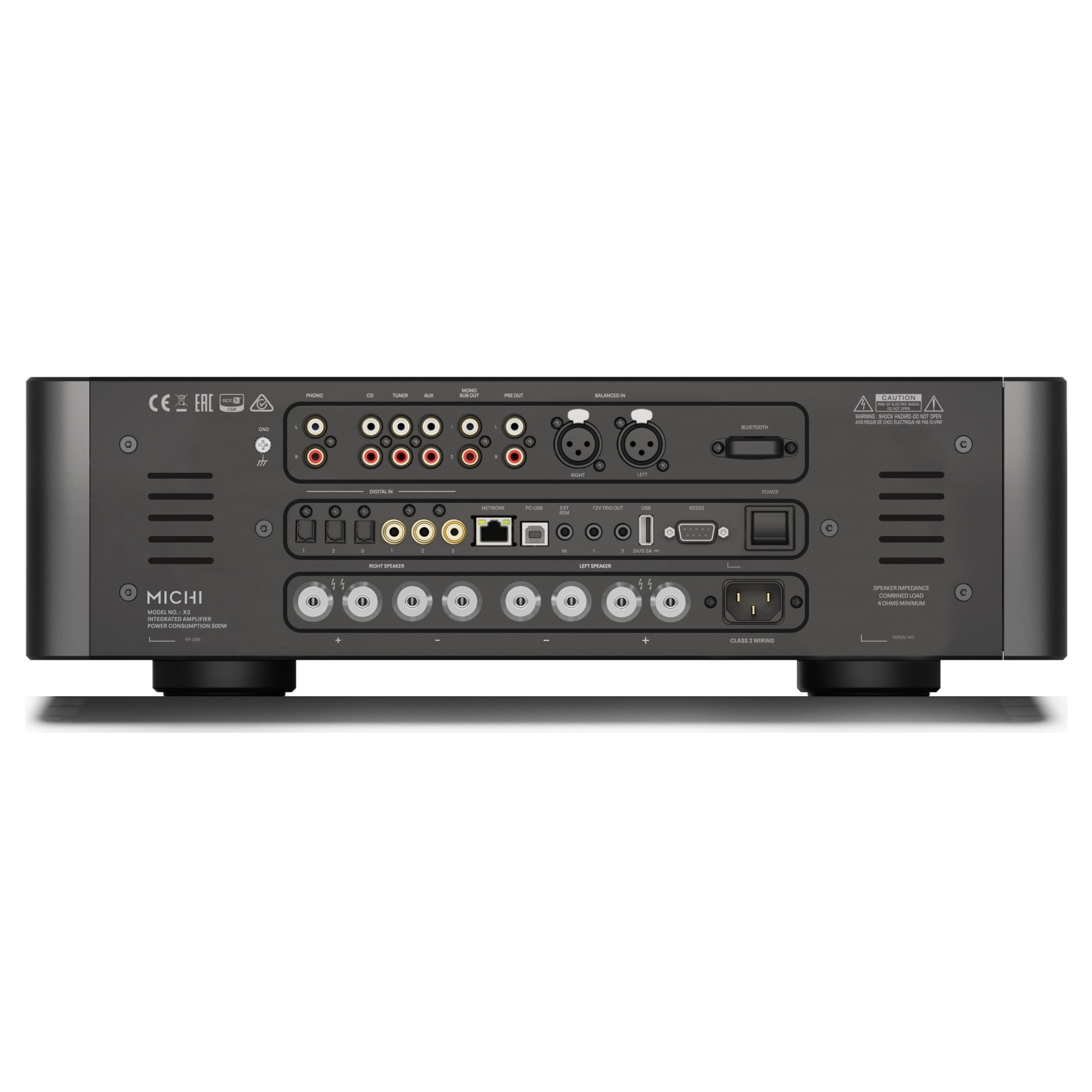 The Michi X3 Integrated Amplifier delivers uncompromised audio performance with a full array of source inputs including Analog, Digital, PC-USB, XLR, apt-X Bluetooth and a Moving Magnet Phono Stage connection for classic vinyl lovers. The X3 is conveniently packaged in an elegant industrial design delivering 350 Watts of Class AB power into 4 ohm speakers while maintaining musical accuracy with exceptional acoustic detail.