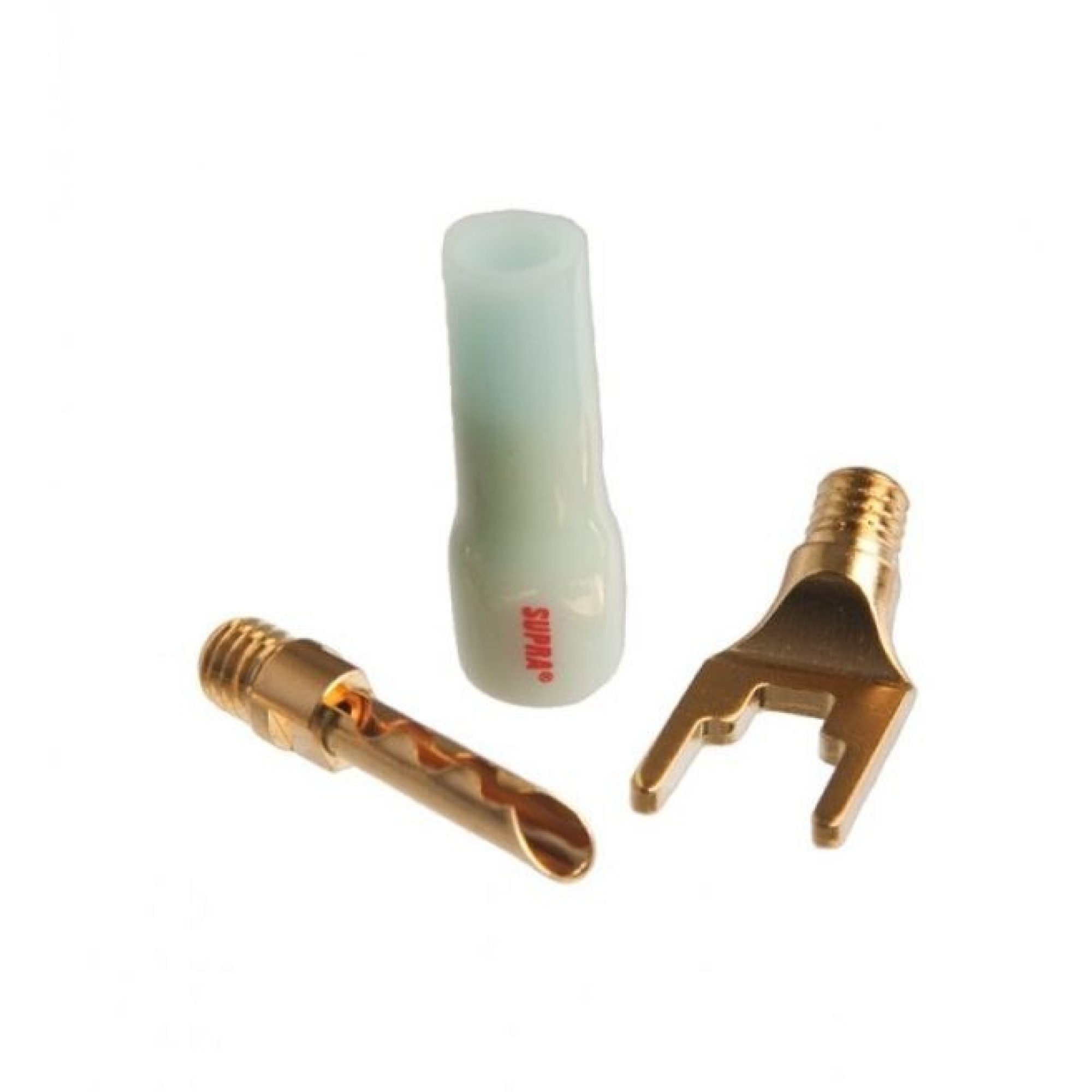 The 24K goldplated Fork (spade) features a two-step inner width to facilitate connection to the vast majority of speaker terminals and the design is reinforced compared to the previous version. The Spade fits into CombiCon Body M6 and CombiCon Crimp Body M6. The Spade is angled for easier mounting in tight spaces.