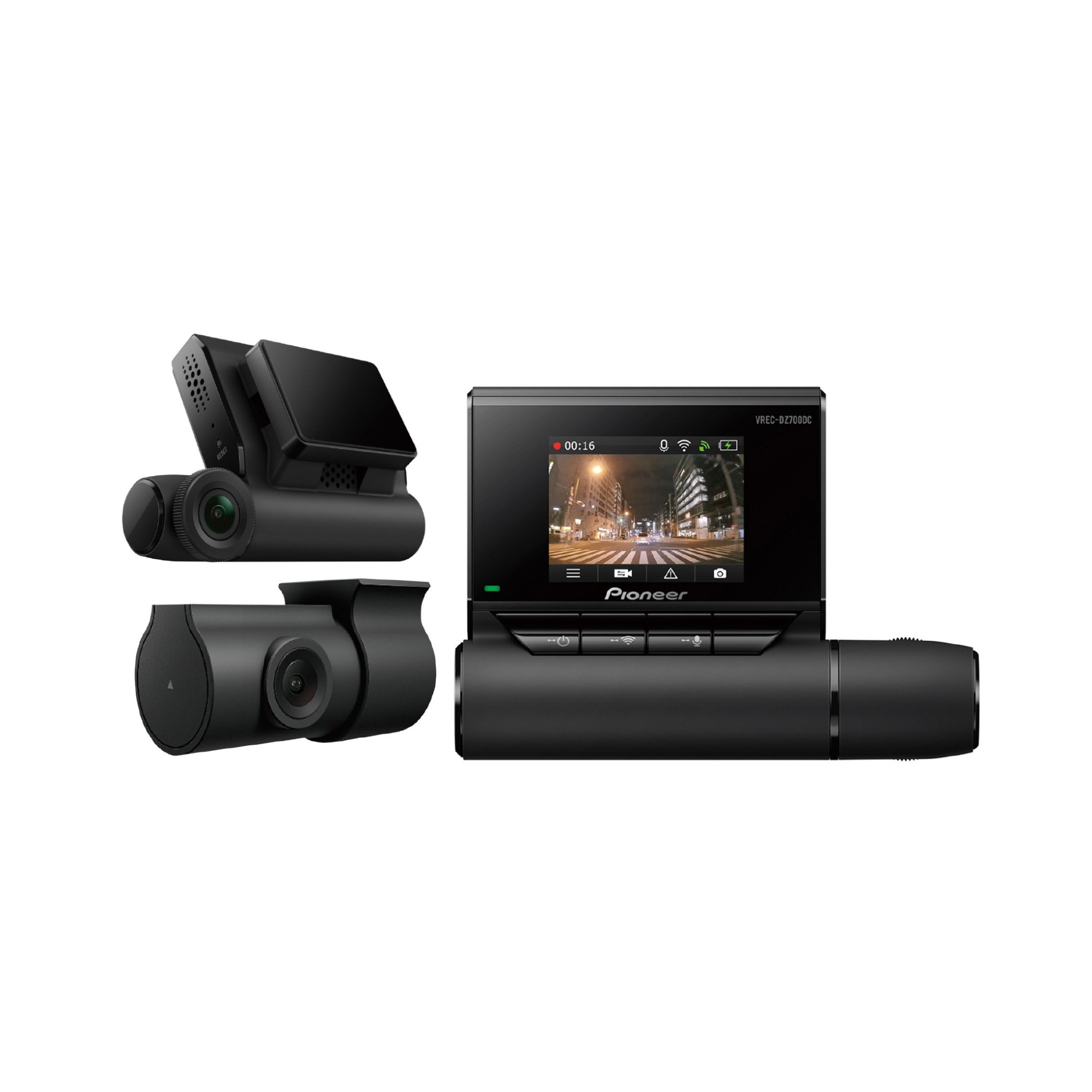Pioneerin VREC-DZ700DC on 2-kanavainen, tehokas Full HD -kojelautakamera, 2 tuuman LCD-näytöllinen etukamera, joka kiinnitetään suoraan tuulilasiin sisäpuolelle, ja pieni peruutuskamera, joka kiinnitetään takalasiin sisäpuolelle. Etukamerassa on 160°:een laajakulmanäkymä, jolla saat kuvattua tietoja, joita muut kamerat eivät näytä.