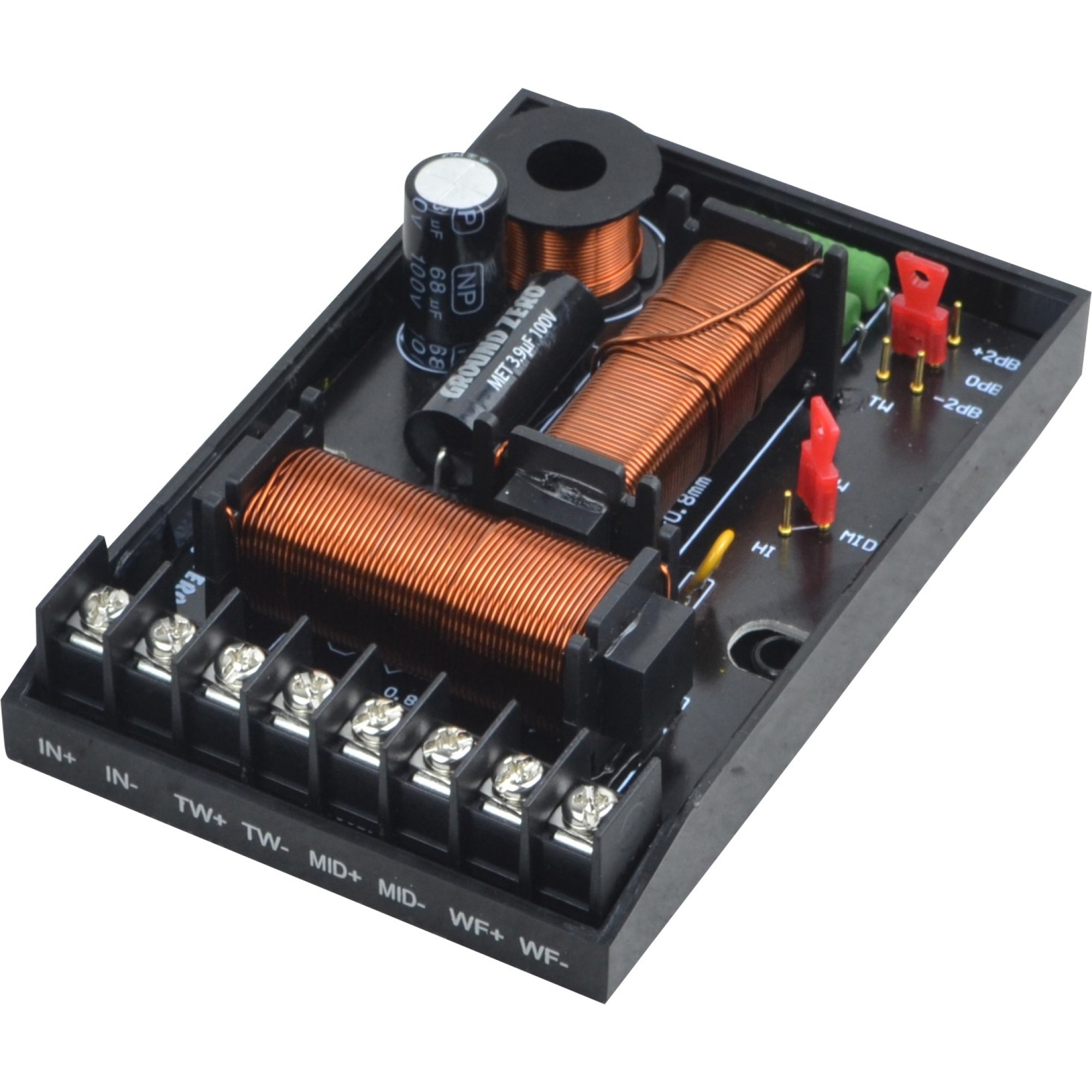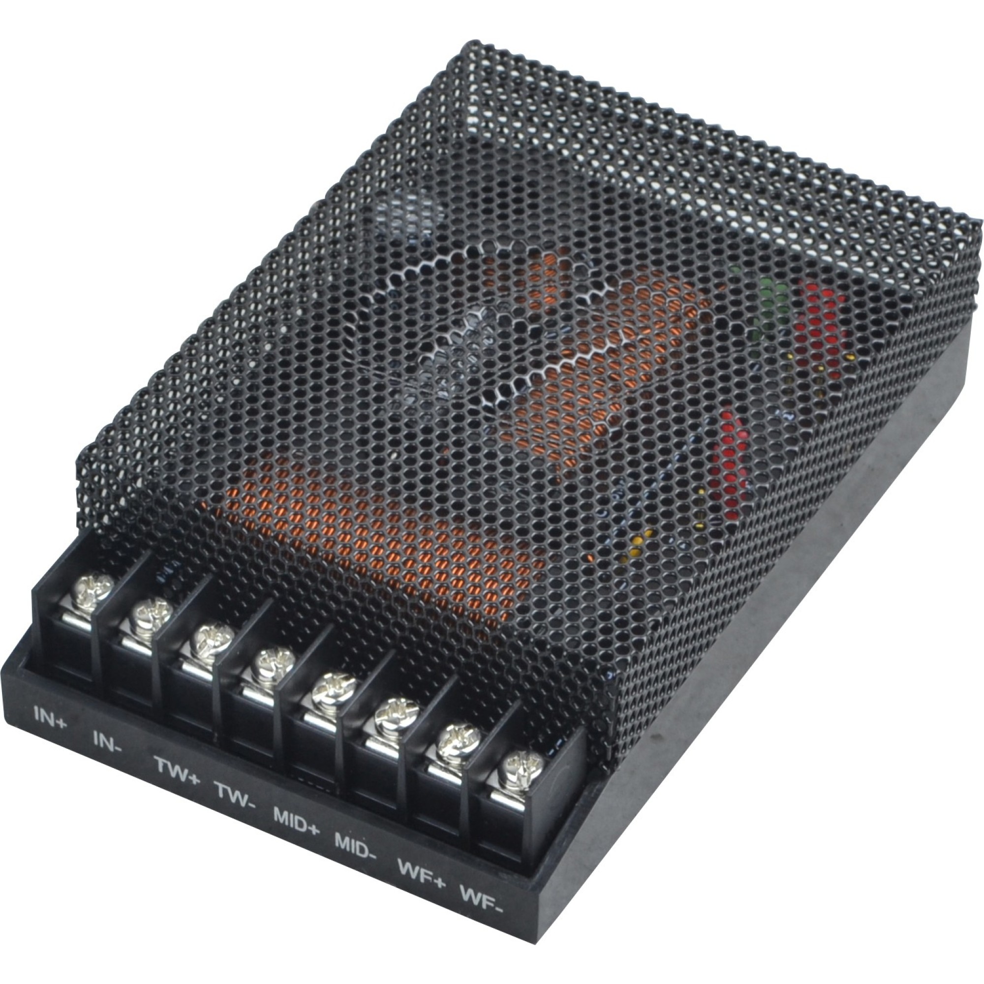 12 dB/oct. crossover (mid/high) / 6 dB/oct. crossover (kickwoofer) / Haxagon protection grill.